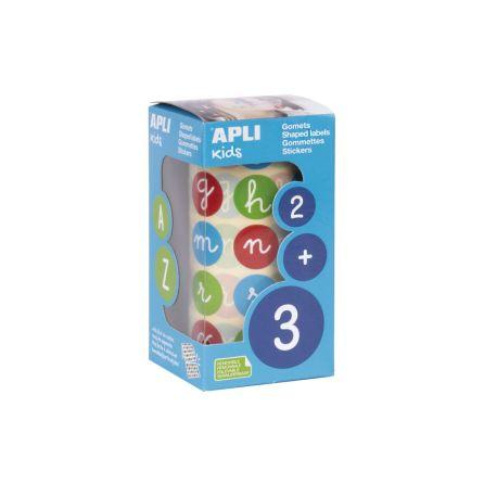 Gomets de letras y abecedario en rollo (redondo Ø20 mm) y sobre (cuadrado).