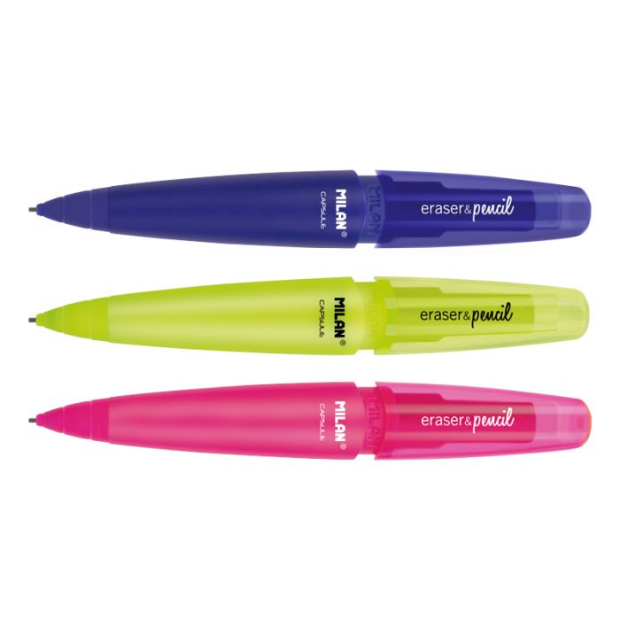 Portaminas eraser&pencil CAPSULE Fluo. Mina de grafito 1.3 mm dureza 2B. Disponible en amarillo, rosa y azul.